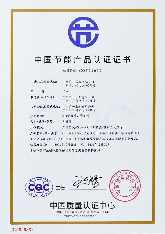组建广州广一泵业有限公司,水泵产品获中国节能产品认证